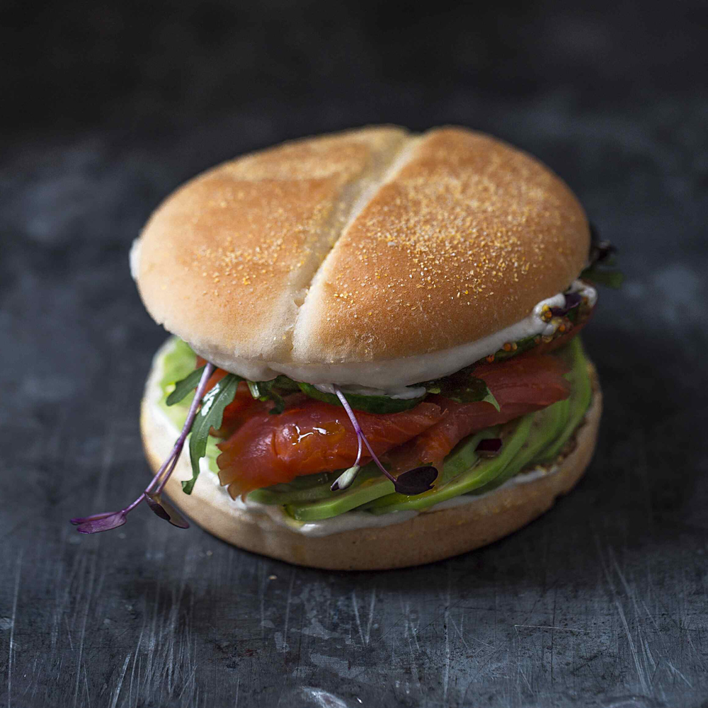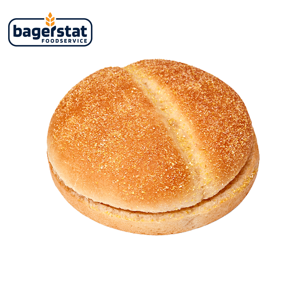 Булочка для бургера Солнечная украшена золотистой кукурузной посыпкой и крафтовым разрезом на шляпке.