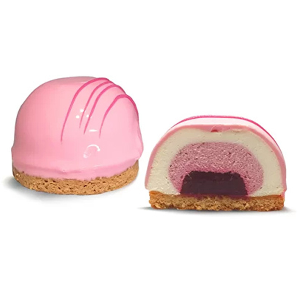 Пирожные Малиновый пломбир - это ароматный малиновый и нежный ванильный муссы на хрустящей песочной основе. Внутри мусса капсула из малинового конфитюра.