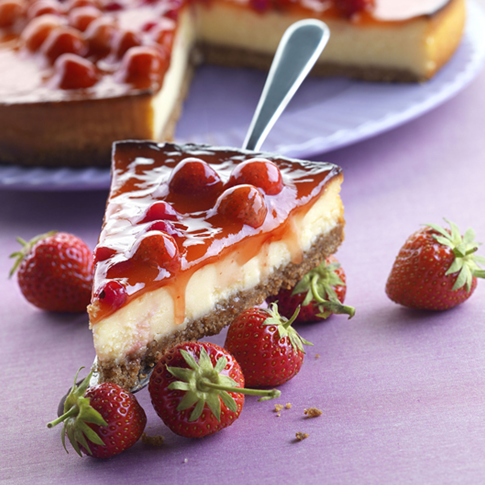 Классический чизкейк на тонком песочном корже с клубникой и смородиной.