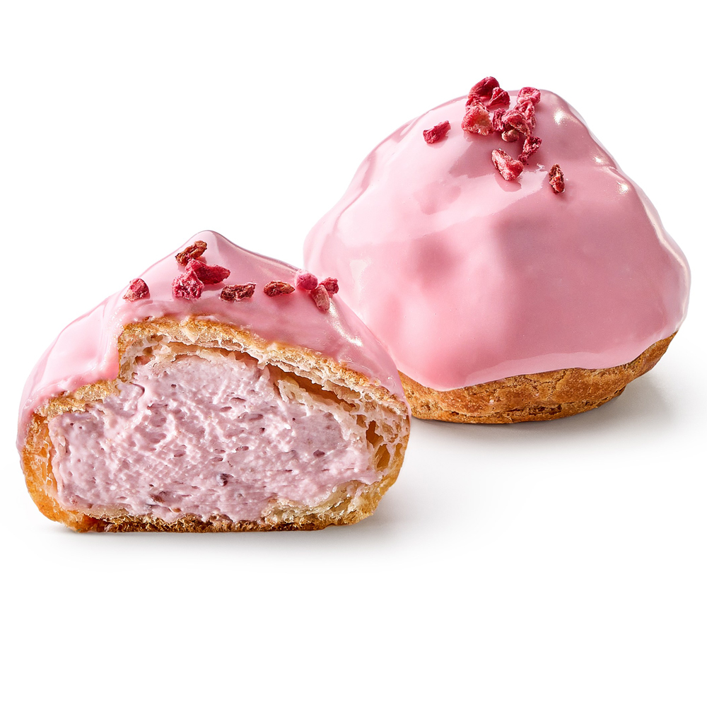 Воздушное пирожное из заварного теста с сырным кремом с добавлением малиновой начинки, приготовленной из свежей ягоды, декорированное глазурью и сублимированной малиной.