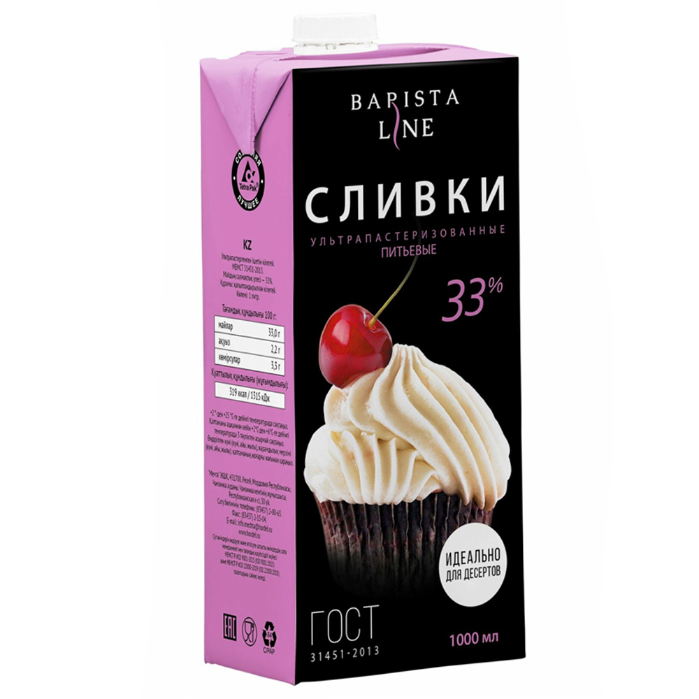 Сливки ультрапастеризованные 33% Barista line отлично взбиваются, подходят для приготовления десертов, муссов, кондитерских изделий.