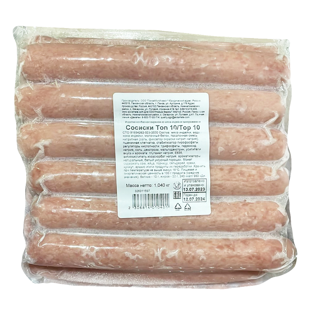Сосиски для хот-дога из индейки вареные 80г (170 мм/ d 24 мм) Топ-10, ~1 кг зам. - 0519100046