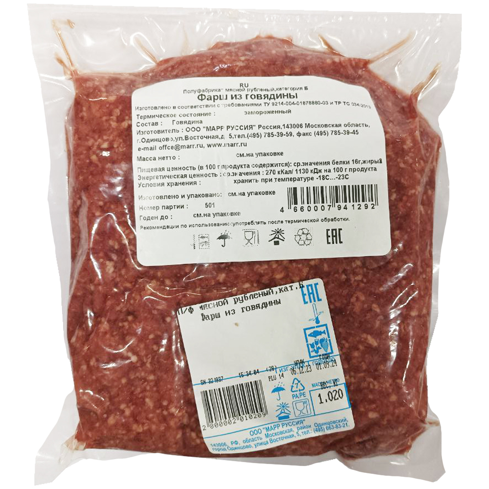 Фарш из говядины – рубленый полуфабрикат, полученный из 100 % говядины (шейного и лопаточного отделов) путем измельчения на мясорубке. Фарш имеет однородную текстуру без жил, пленок и соединительной ткани. Готовый полуфабрикат упаковывается в пакет.