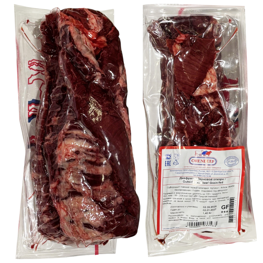 Тонкую диафрагму Grain-fed получают из бычков породы Герефорд. Благодаря зерновому откорму мясо приобретает выраженный мраморный рисунок, а вкус мяса становится более нежный.