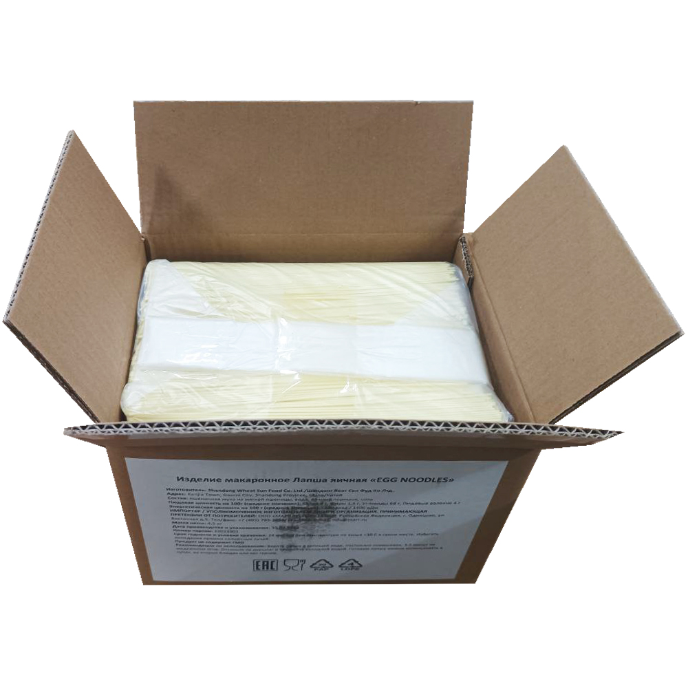 Яичная лапша изготовлена из пшеничной муки высшего качества с добавлением яичного порошка. Лапша тонкая, обладает отличным вкусом и хорошей эластичностью.