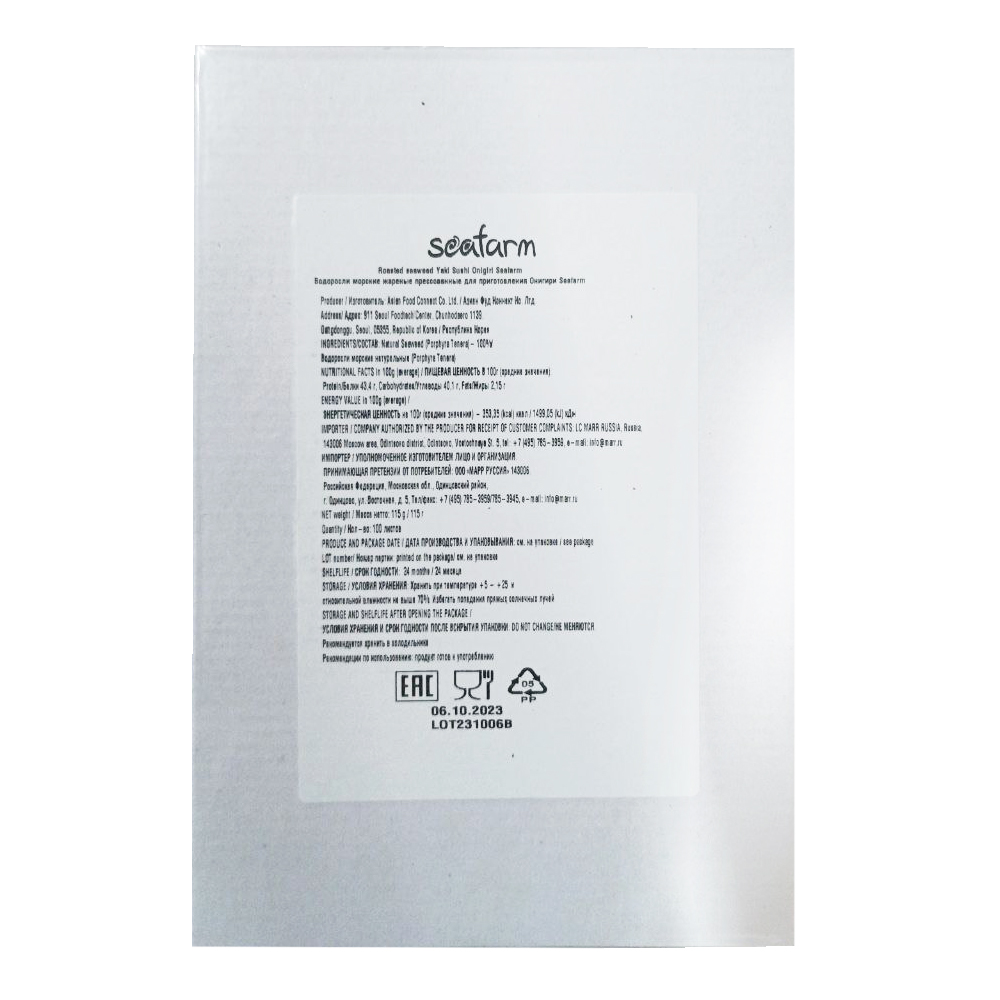 Водоросли для Онигири жареные Seafarm 100 листов 115г, Корея - 12100210520