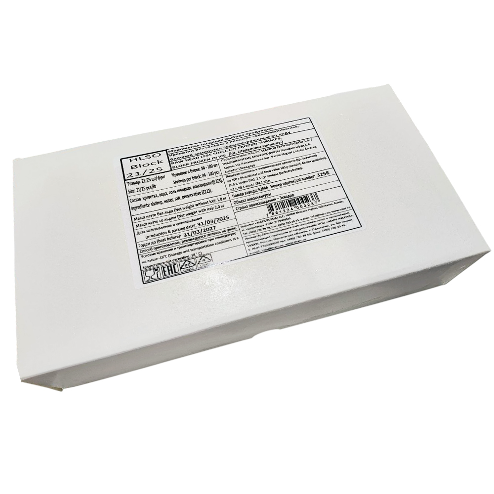 Креветки без головы во льду 21/25 10,8кг (6 шт х 1,8кг), Эквадор