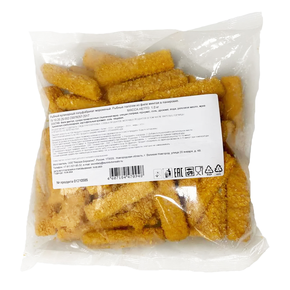 Состав: филе минтая, сухари панировочные (пшеничная мука, специи (паприка, куркума), соль, дрожжи), вода, рапсовое масло, мука пшеничная хлебопекарная, картофельный крахмал, соль пищевая.