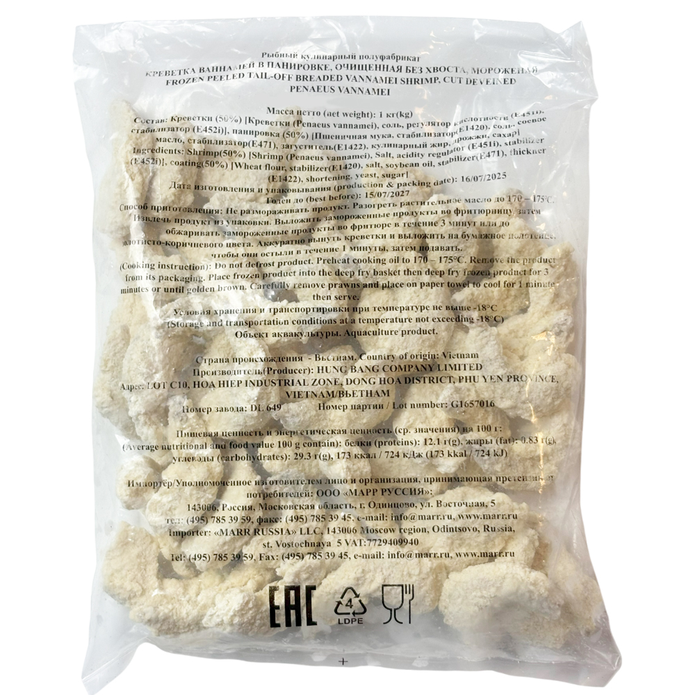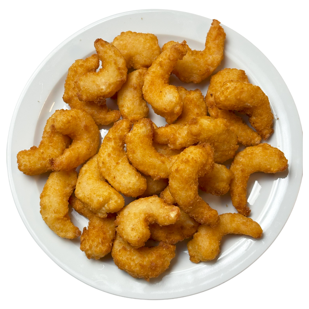 Калиброванные креветки весом 16-20 грамм в воздушной панировке.