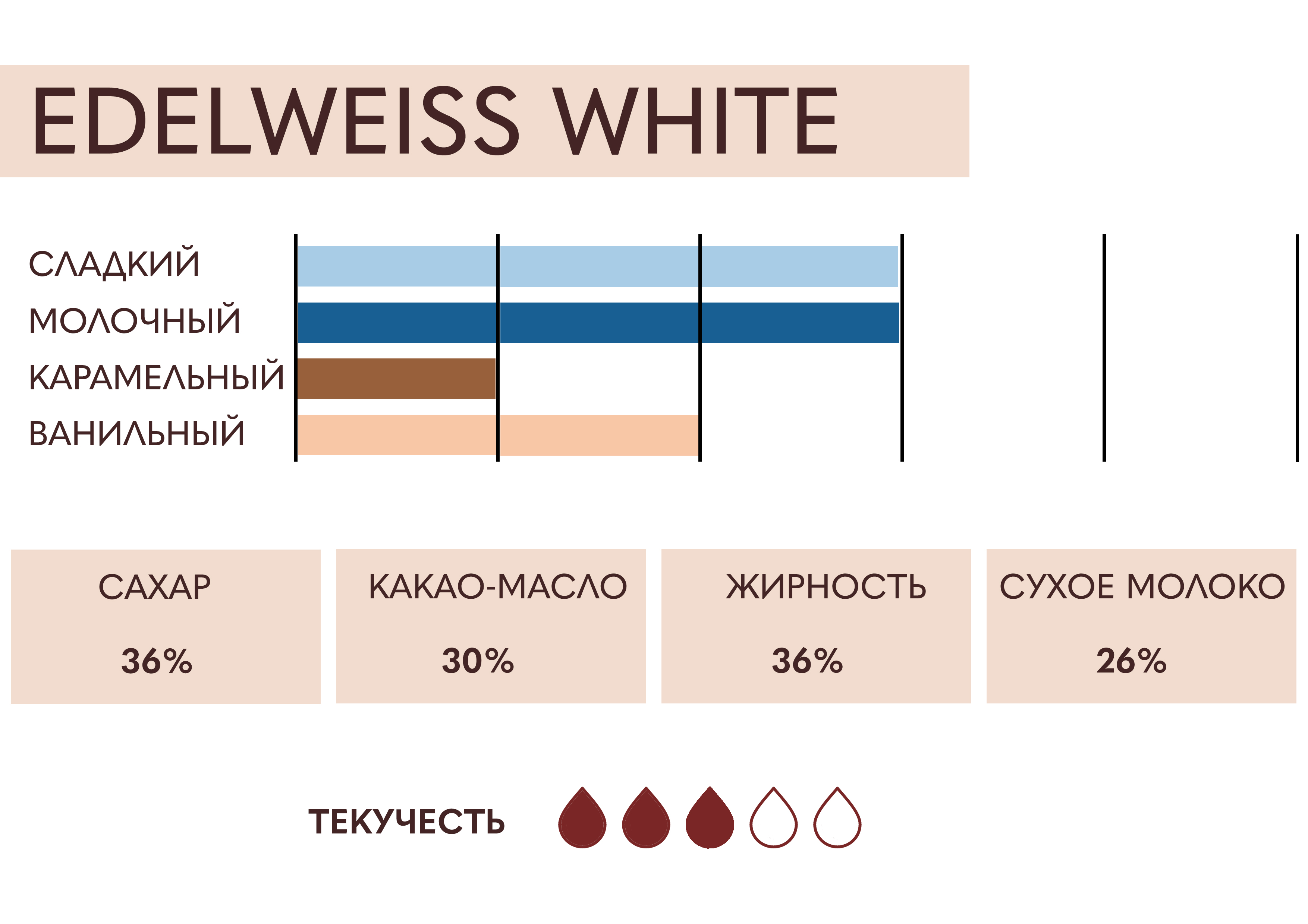 Превосходный белый шоколад. Идеален для производства шоколадных плиток, шоколадных фигур, конфет, покрытий кондитерских изделий, приготовления муссов, начинок, ганаша, шоколадного декора.