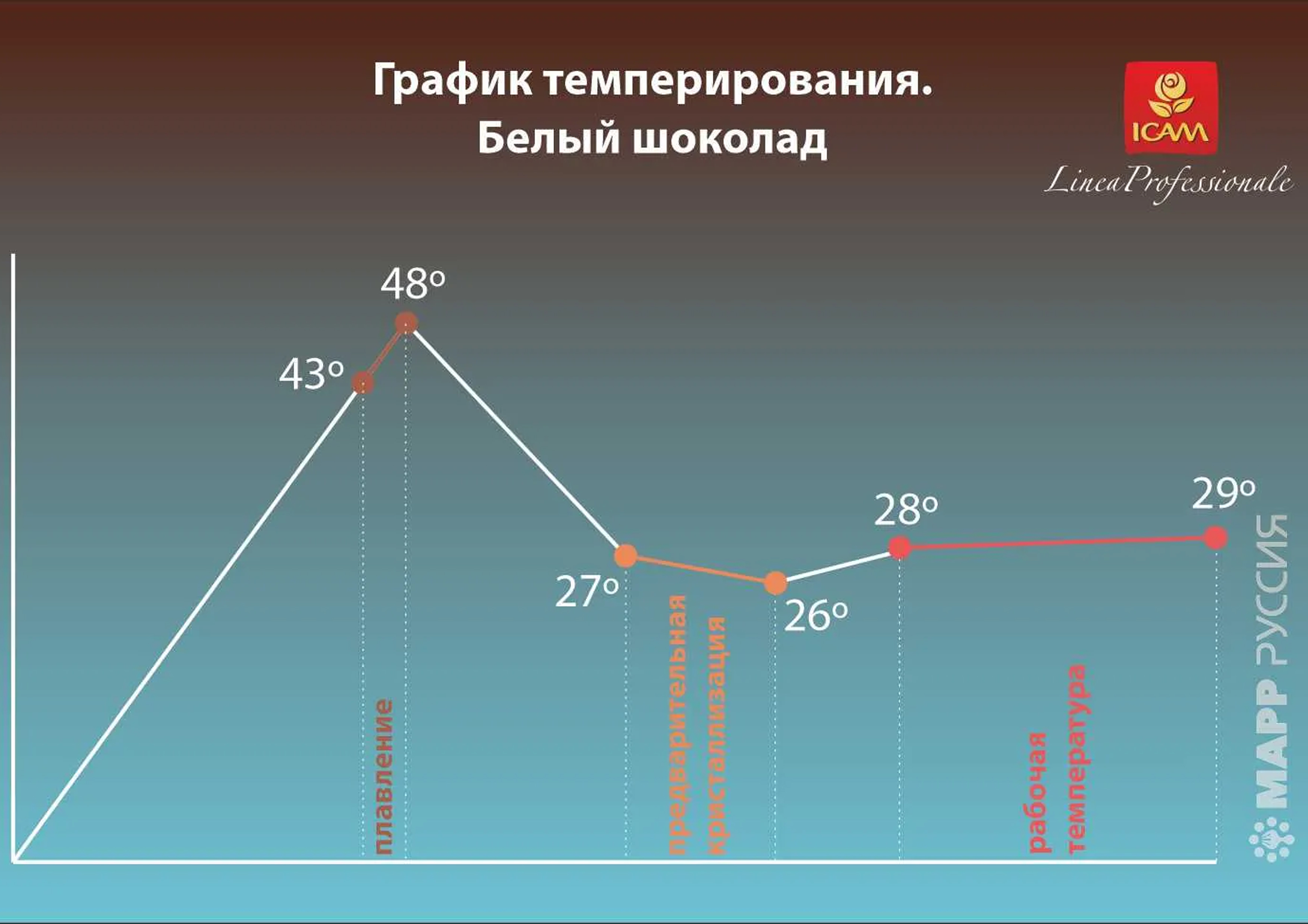 Перед работой шоколад нужно темперировать: сначала растопить на водяной бане до 43-48°С, постоянно помешивая, затем быстро охладить до 26°С и снова догреть до 28°С. Рабочая температура шоколада 28-29°С.
