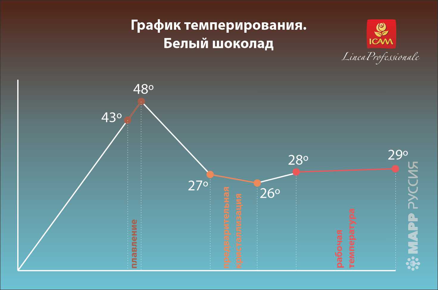 Перед работой шоколад нужно темперировать: сначала растопить на водяной бане до 43-48°С, постоянно помешивая, затем быстро охладить до 26°С и снова догреть до 28°С. Рабочая температура шоколада 28-29°С.