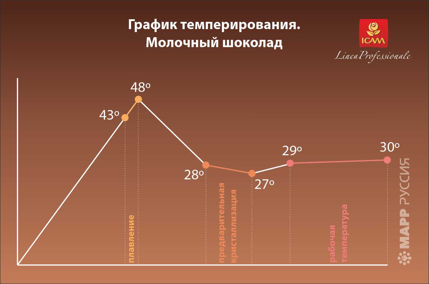 Перед работой шоколад нужно темперировать: сначала растопить на водяной бане до 43-48°С, постоянно помешивая, затем быстро охладить до 27°С и снова догреть до 29°С. Рабочая температура шоколада 29-30°С.
