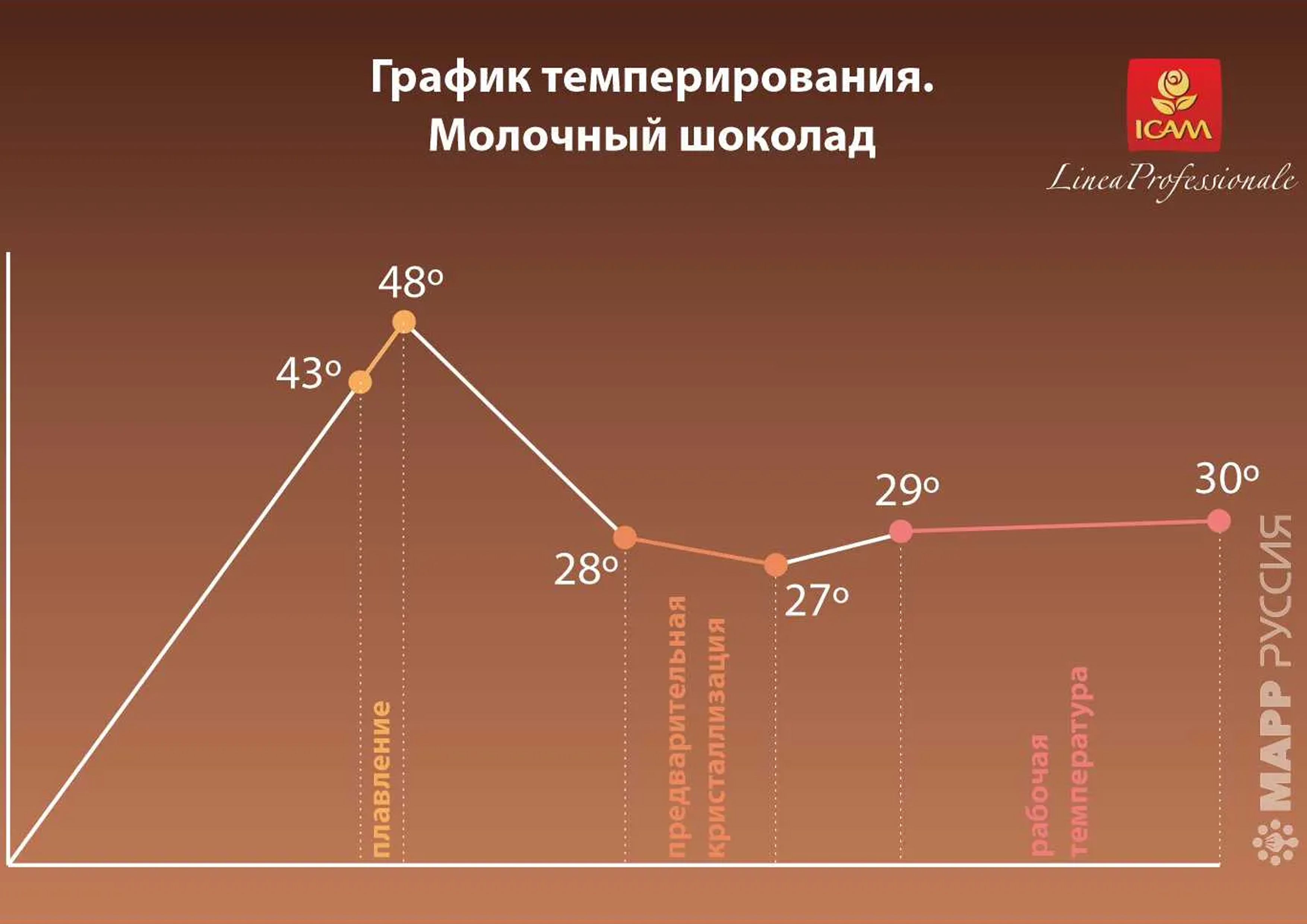 Перед работой шоколад нужно темперировать: сначала растопить на водяной бане до 43-48°С, постоянно помешивая, затем быстро охладить до 27°С и снова догреть до 29°С. Рабочая температура шоколада 29-30°С.