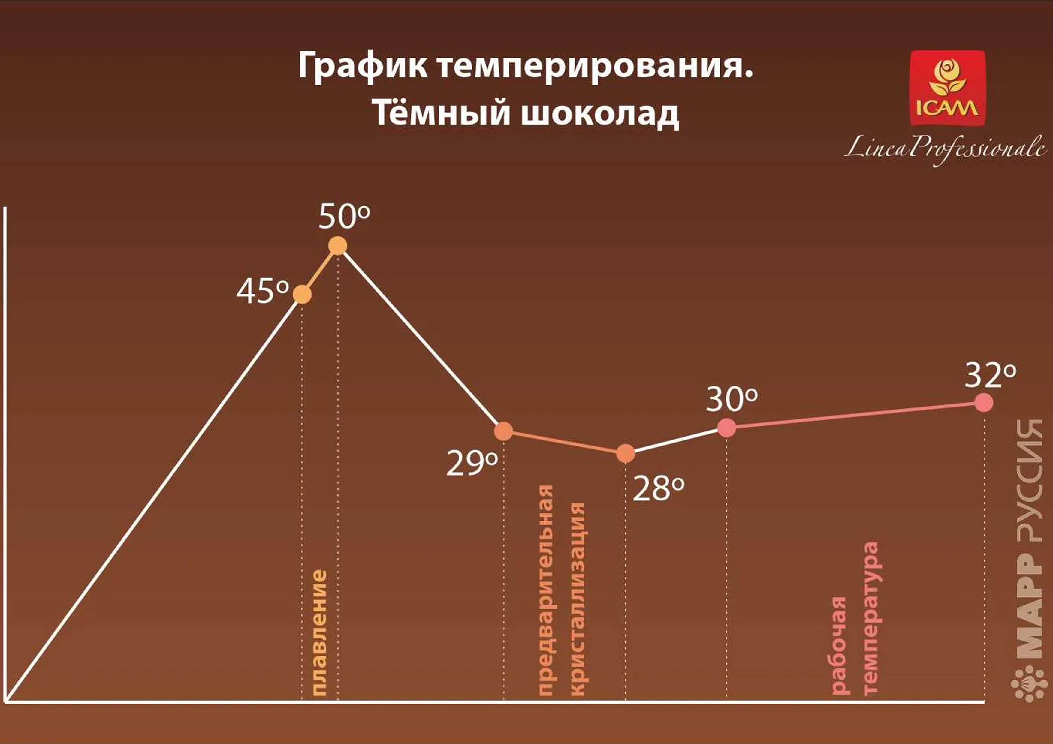Перед работой шоколад нужно темперировать: сначала растопить на водяной бане до 45-50°С, постоянно помешивая, затем быстро охладить до 28 °С и снова догреть до 32°С. Рабочая температура шоколада 30-32°С.